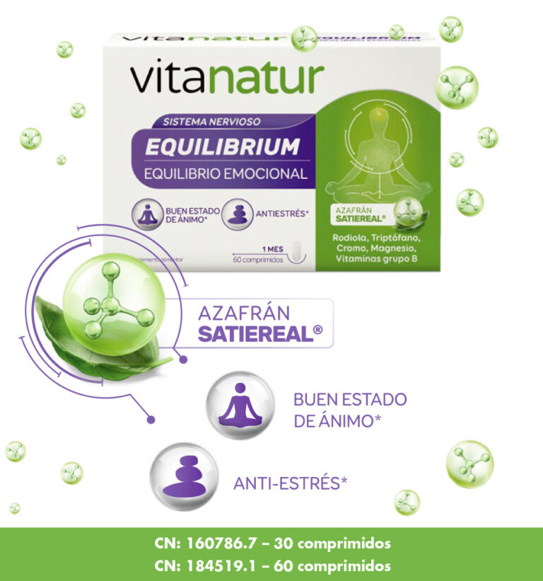 Vitanatur Equilibrium es un complemento alimenticio a base de azafrán, rodiola, triptófano, cromo, magnesio y vitaminas del grupo B.